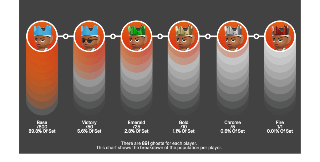 ghost parallels function just like trading card parallels. The parallel variants have different visual elements, and they are produced in much lower numbers, making them more rare and more valuable to l collectors.